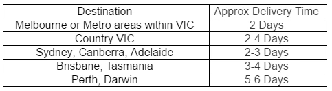 Once your order has been dispatched you will receive a tracking number from the provider that we have shipped with. In most cases we will ship with Australia Post, their delivery time frames are listed below.