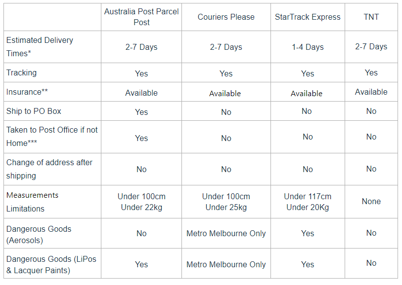 *** Orders sent with Australia Post will be taken to your local post office if you are not home at the time of your delivery. Startrack and TNT orders will be returned to their local Depot and delivery will be attempted again the following day. Once delivery has been attempted twice it will be held at their depot or returned to sender (RTS). RTS will incur a fee, payable by the customer before we resend the order.